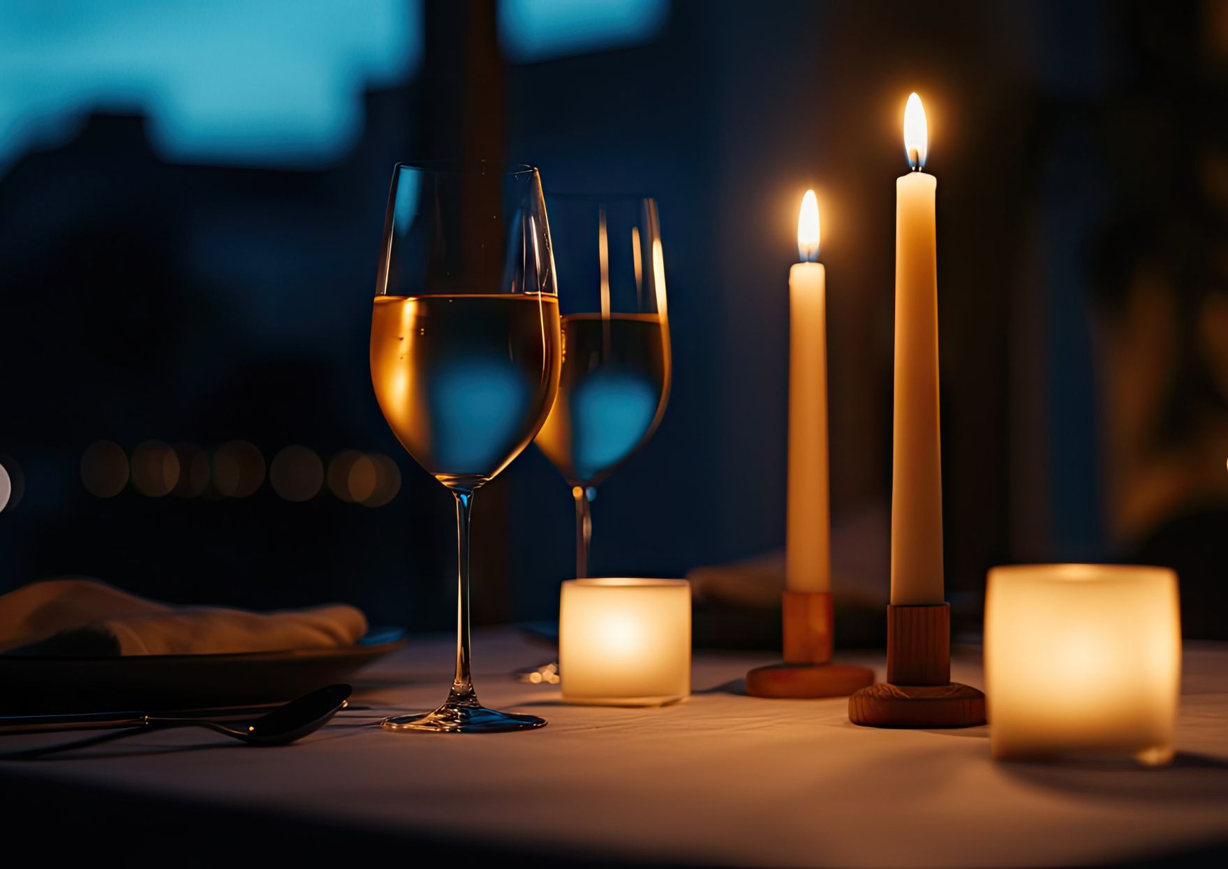 Fotografía de una mesa para dos en un restaurante, con copas de vino y velas, creando un ambiente cálido e íntimo. Imagen utilizada para ilustrar el artículo sobre vinos para San Valentín en restaurantes de Valencia, con propuestas por copas, maridajes y recomendaciones para mejorar la experiencia sin complicar el servicio.